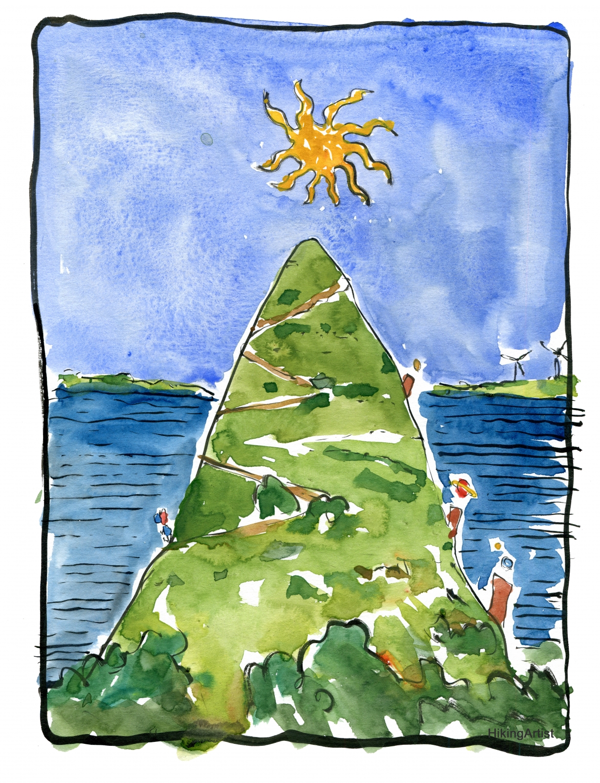 Kystvandring er det meste af tiden en vandring tæt på vandet, men udenfor København gav en enlig stejl og meget stor høj en særlig chance – Øverst ventede solen, som starten på en af de særlige planet-stier, hvor planeterne er placeret i landskabet, skaleret i størrelse, relativt, så man kan fornemme de store forskelle og enorme afstande imellem dem til fods